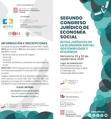El 2º Congreso Jurídico de CIRIEC-España tendrá lugar los días 29 y 30 de septiembre de 2025 en el UPF Barcelona School of Management bajo el lema Retos jurídicos de la economía social: sostenibilidad y eficiencia. El Congreso se celebra en un momento histórico de la economía social, que la sitúan frente a importantes desafíos a todos los niveles, y que adquieren en la actualidad especial relevancia por la tramitación del Proyecto de Ley integral de impulso de la Economía Social. Se prevé la presentación de más de medio centenar de ponencias. El plazo para inscribirse al Congreso continúa abierto. Para la inscripción al Congreso se ha habilitado este link.